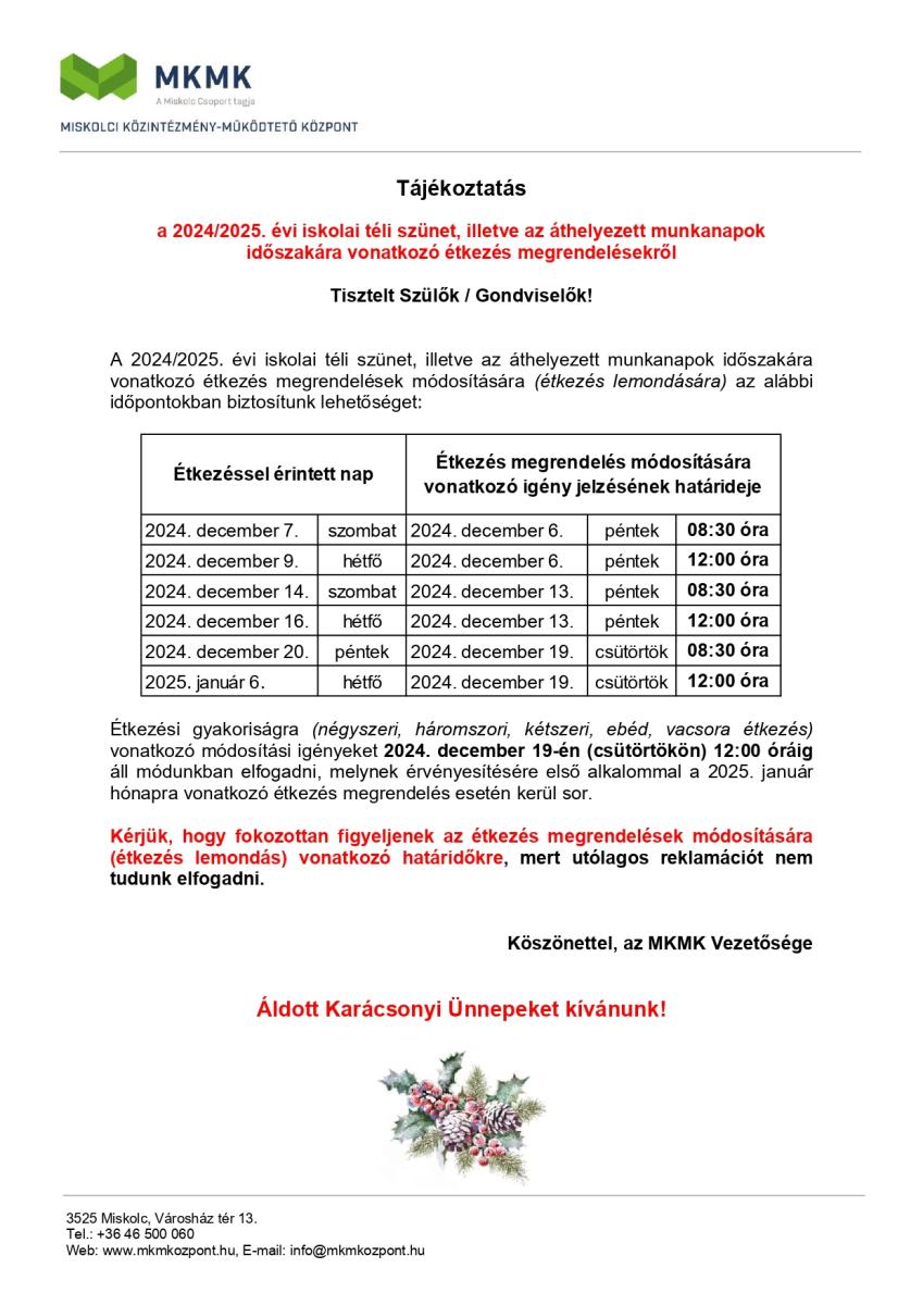 Tájékoztatás a 2024/2025. évi iskolai téli szünet, illetve az áthelyezett munkanapok időszakára vonatkozó étkezés megrendelésekről